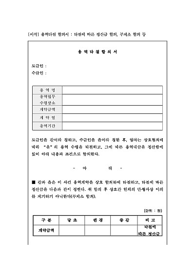 주요내용 : 용역계약 중단에 따른 기성금 정산, 손해배상 면제, 계약해지, 권리포기 등의 사항을 명시하여 용역타절에 따른 분쟁을 미연에 방지하기 위한 목적으로 사용되어지는 문서 양식임. 단 무단전재 방지 목적으로 PDF 파일로 올리니, 구매하신 후 혹 원본 파일이 필요하신 분들은 톡이나 문자, 메일, 전화 등을 주시면 작성 방법 등에 대한 간단한 무료 상담과 함께 원본 파일을 보내드리도록 하겠습니