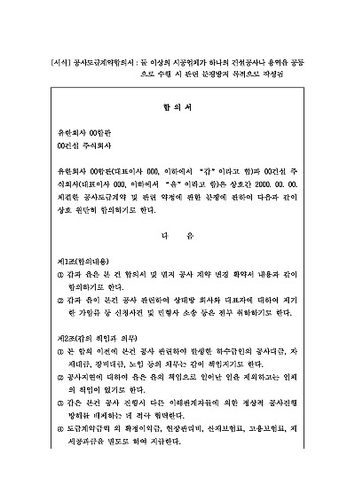 주요내용 : 둘 이상의 시공업체가 하나의 건설공사나 용역을 공동으로 수행하기 위해 사전에 책임과 역할을 합의하고 이를 문서로 명시하는 공식 계약서 양식임. 단 무단전재 방지 목적으로 PDF 파일로 올리니, 구매하신 후 혹 원본 파일이 필요하신 분들은 톡이나 문자, 메일, 전화 등을 주시면 작성 방법 등에 대한 간단한 무료 상담과 함께 원본 파일을 보내드리도록 하겠습니다.