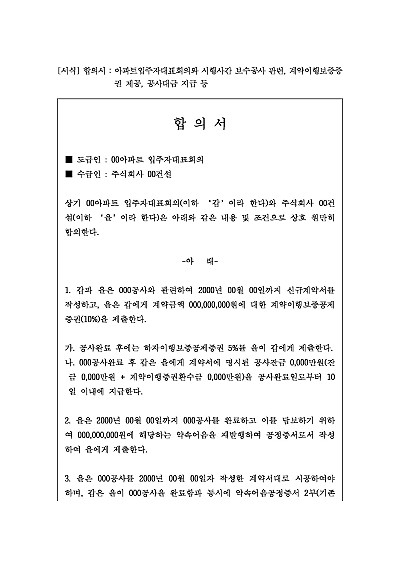 합의서 : 아파트입주자대표회의와 시행사간 보수공사 관련, 계약이행보증증권 제공, 공사대금 지급 등 요약정보 및 구매