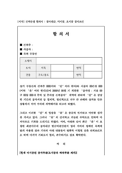 건축분쟁 합의서 : 공사대금, 미시공, 오시공 공사조건 요약정보 및 구매