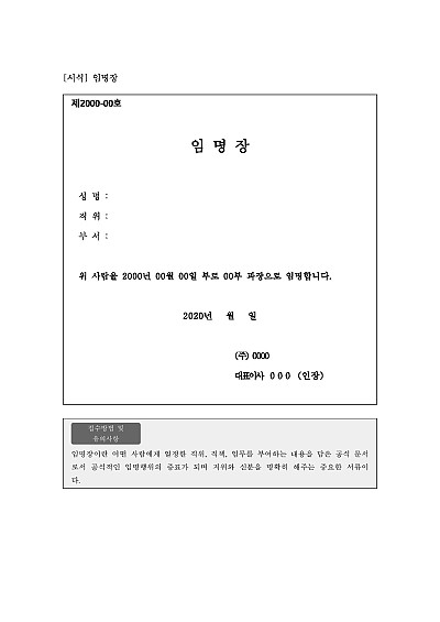 주요내용 : 어떤 사람에게 일정한 직위, 직책, 임무를 부여하는 내용을 담은 공식 문서 양식임.단 무단전재 방지 목적으로 PDF 파일로 올리니, 구매하신 후 혹 원본 파일이 필요하신 분들은 톡이나 문자, 메일, 전화 등을 주시면 작성 방법 등에 대한 간단한 무료 상담과 함께 원본 파일을 보내드리도록 하겠습니다.