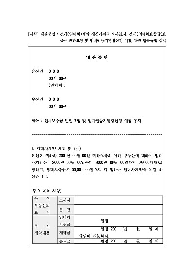 주요내용 : 전세(임대차)계약 체결 후 기간만료에 따른 계약갱신거절의 의사표시 및 그에 따른 보증금 등의 반환 그리고 그 지체시 법적절차에 착수할 것임을 통지함으로써 상대방에게 법적 분쟁이 시작될 수 있음을 알리고 심리적 압박을 주어 소송 전 상대방의 자발적 이행 및 합의를 유도하기 위한 목적으로 사용되어지는 양식임.단 무단전재 방지목적으로PDF파일로 올리니,구매하신 후 혹 원본 파일이 필요하신 분들은 톡이나 문자,메일,전화 등을 주시면 작성방법 등에 대한 간단한 무료상담과 함께 원본 파일을 보내드리도록 하겠습니다.