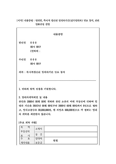 주요내용 : 임대차계약체결 후 묵시적개신에 의한 계약연장 시 상가임대차보호법의 규정에 기하여 당해 임대차계약의 해지를 통지함으로써 상대방에게 법적 분쟁이 시작될 수 있음을 알리고 심리적 압박을 주어 소송 전 상대방의 자발적 이행 및 합의를 유도하기 위한 목적으로 사용되어지는 양식임.단 무단전재 방지목적으로PDF파일로 올리니,구매하신 후 혹 원본 파일이 필요하신 분들은 톡이나 문자,메일,전화 등을 주시면 작성방법 등에 대한 간단한 무료상담과 함께 원본 파일을 보내드리도록 하겠습니다.