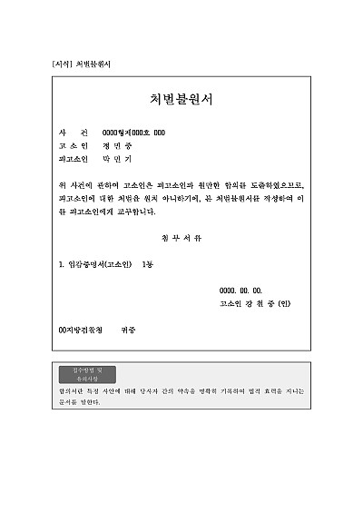 주요내용 : 형사사건의 피해자가 가해자의 처벌을 원하지 않는다는 의사를 공식적으로 표시하는 문서 양식임. 단 무단전재 방지 목적으로 PDF 파일로 올리니, 구매하신 후 혹 원본 파일이 필요하신 분들은 톡이나 문자, 메일, 전화 등을 주시면 작성 방법 등에 대한 간단한 무료 상담과 함께 원본 파일을 보내드리도록 하겠습니다.
