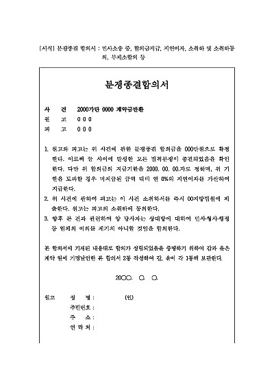 주요내용 : 분쟁 발생 시 당사자들이 민사상 손해배상 등에 대해 합의한 내용을 문서 양식임. 단 무단전재 방지 목적으로 PDF 파일로 올리니, 구매하신 후 혹 원본 파일이 필요하신 분들은 톡이나 문자, 메일, 전화 등을 주시면 작성 방법 등에 대한 간단한 무료 상담과 함께 원본 파일을 보내드리도록 하겠습니다.