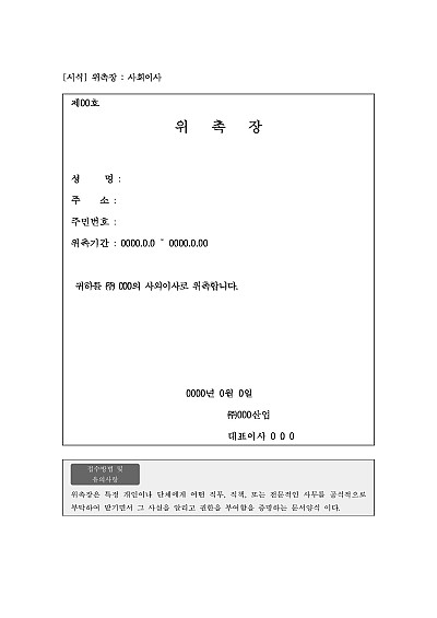 주요내용 특정 개인이나 단체에게 어떤 직무직책또는 전문적인 사무를 공식적으로 부탁하여 맡기면서 그 사실을 알리고 권한을 부여함을 증명하는 문서 양식임단 무단전재 방지 목적으로 PDF 파일로 올리니구매하신 후 혹 원본 파일이 필요하신 분들은 톡이나 문자메일전화 등을 주시면 작성 방법 등에 대한 간단한 무료 상담과 함께 원본 파일을 보내드리도록 하겠습니다.