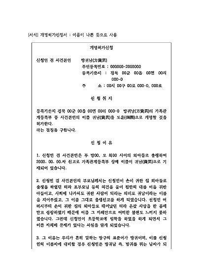한자식 이름, 이름이 나쁜 뜻이나 놀림의 대상으로 사용 개명신청, 전체적인 형식 및 기재방법 등을 참고하여 본 신청서를 수정하여 사용하는 방법으로 개명신청을 하면됩니다. 단, 무단 전재방지를 위해 pdf 파일로 올리니, 원본파일이 필요하신 분들은 톡이나 메일 전화를 주시면 간단한 작성방법 상담과 함께 보내드리겠습니다.
