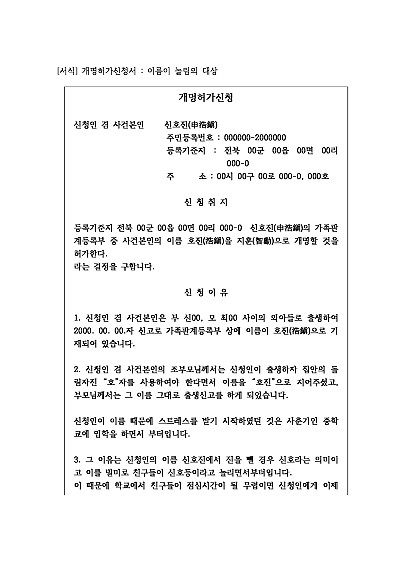 이름이 나쁜 의미로 사용, 친구들의 놀림의 대상, 이름에 대한 컴플렉스 개명신청, 전체적인 형식 및 기재방법 등을 참고하여 본 신청서를 수정하여 사용하는 방법으로 개명신청을 하면됩니다. 단, 무단 전재방지를 위해 pdf 파일로 올리니, 원본파일이 필요하신 분들은 톡이나 메일 전화를 주시면 간단한 작성방법 상담과 함께 보내드리겠습니다.