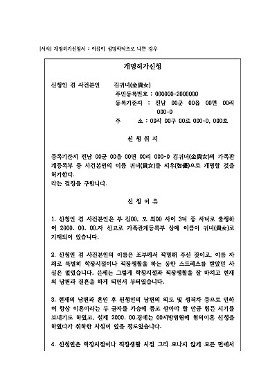 성명학적으로 좋지 아니한 이름, 이혼 등 가정불화의 원인제공 개명신청, 전체적인 형식 및 기재방법 등을 참고하여 본 신청서를 수정하여 사용하는 방법으로 개명신청을 하면됩니다. 단, 무단 전재방지를 위해 pdf 파일로 올리니, 원본파일이 필요하신 분들은 톡이나 메일 전화를 주시면 간단한 작성방법 상담과 함께 보내드리겠습니다. 추가로 관할, 제출부수, 신청인, 비용 등 기재