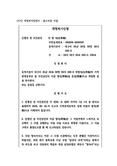 흔하고 촌스러운 이름, 놀림의 대상이 되는 이름 개명신청, 전체적인 형식 및 기재방법 등을 참고하여 본 신청서를 수정하여 사용하는 방법으로 개명신청을 하면됩니다. 단, 무단 전재방지를 위해 pdf 파일로 올리니, 원본파일이 필요하신 분들은 톡이나 메일 전화를 주시면 간단한 작성방법 상담과 함께 보내드리겠습니다.