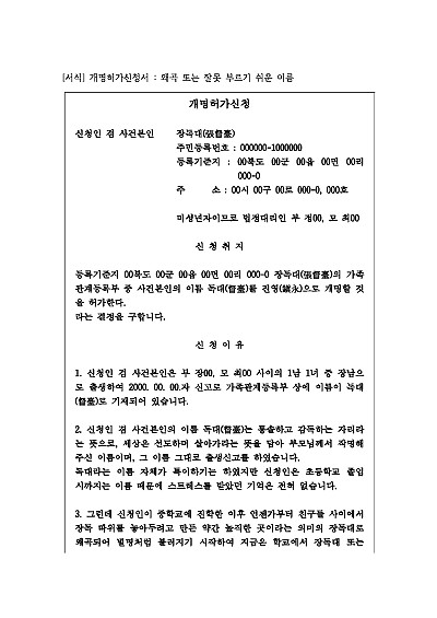 고등학생, 왜곡 또는 잘못 부르기 쉬운 이름 때문에 조롱과 놀림을 당하며 많은 스트레스를 받고 학업에 집중하기 어렵다는 이유 등으로 개명신청, 전체적인 형식 및 기재방법 등을 참고하여 본 신청서를 수정하여 사용하는 방법으로 개명신청을 하시면됩니다. 추가로 관할, 제출부수, 신청인, 비용 등 기재