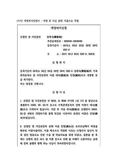 개명 후 사고, 질병 등 불운한 일이 계속되어 다시 작명 후 개명신청, 전체적인 형식 및 기재방법 등을 참고하여 본 신청서를 수정하여 사용하는 방법으로 개명신청을 하면됩니다. 추가로 관할, 제출부수, 신청인, 비용 등 기재