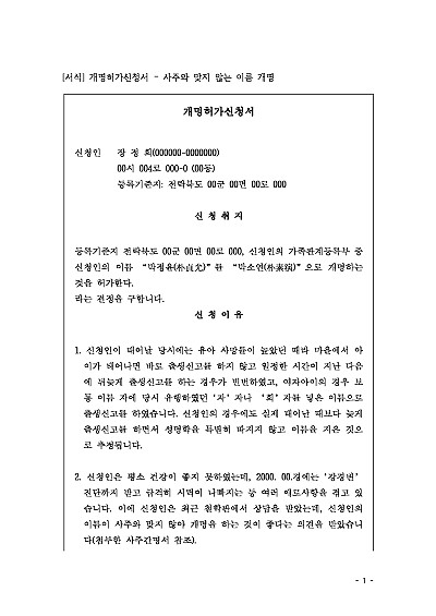 자신의 이름과 사주가 맞지 아니하여 잦은 병치례 등의 고생을 하고 있다는 등의 사유로 개명신청, 전체적인 형식 및 기재방법 등을 참고하여 본 신청서를 수정하여 사용하는 방법으로 개명신청을 하시면됩니다. 추가로 관할, 제출부수, 신청인, 비용 등 기재