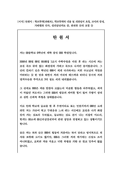주요내용:탄원서는 형사 처벌이나 징계 위기에 처한 사람에 대해선처를 호소하거나, 반대로 엄벌을 요구하는 내용을 담아 수사기관이나 법원에 제출하는 공식 문서로서, 주로 가족, 지인, 직장 동료 등이 작성하며, 피의자나 피고인의 평소 행실과 반성 의지를 설명하여 양형 결정에 영향을 미치게 하려는 목적으로 제출함.단 무단전재 방지목적으로PDF파일로 올리니,구매하신 후 혹 원본 파일이 필요하신 분들은 톡이나 문자,메일,전화 등을 주시면 작성방법 등에 대한 간단한 무료상담과 함께 원본 파일을 보내드리도록 하겠습니다.