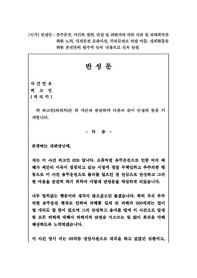 반성문 : 음주운전, 사건의 경위, 반성 및 피해자에 대한 사죄 및 피해회복을 위한 노력, 대리운전 호출사실, 주차문제로 차량 이동, 생계활동을 위한 운전면허 필수적 등의 내용으로 선처 탄원 요약정보 및 구매