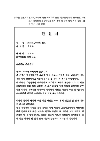 주요내용 : 탄원서는 형사 처벌이나 징계 위기에 처한 사람에 대해 선처를 호소하거나, 반대로 엄벌을 요구하는 내용을 담아 수사기관이나 법원에 제출하는 공식 문서로서, 주로 가족, 지인, 직장 동료 등이 작성하며, 피의자나 피고인의 평소 행실과 반성 의지를 설명하여 양형 결정에 영향을 미치게 하려는 목적으로 제출함.단 무단전재 방지목적으로 PDF파일로 올리니,구매하신 후 혹 원본 파일이 필요하신 분들은 톡이나 문자, 메일, 전화 등을 주시면 작성방법 등에 대한 간단한 무료상담과 함께 원본 파일을 보내드리도록 하겠습니다.