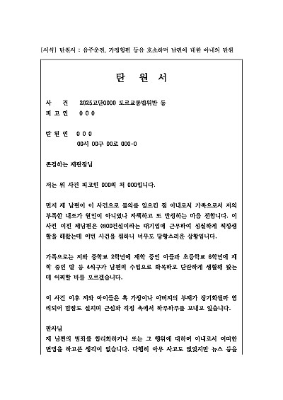 탄원서 : 음주운전, 가정형편 등을 호소하며 남편에 대한 아내의 탄원 요약정보 및 구매