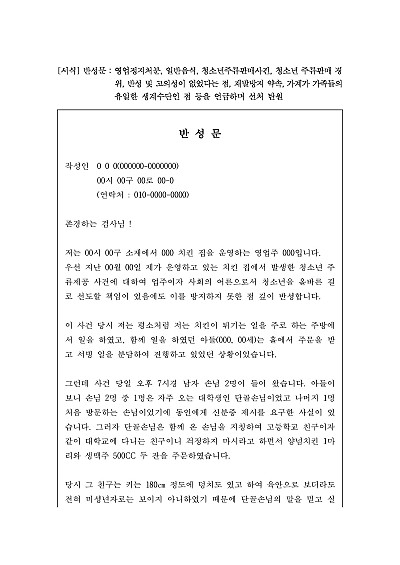 반성문 : 영업정지처분, 일반음식, 청소년주류판매사건, 청소년 주류판매 경위, 반성 및 고의성이 없었다는 점, 재발방지 약속, 가계가 가족들의 유일한 생계수단인 점 등을 언급하며 선처 탄원 요약정보 및 구매