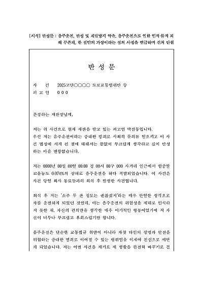 반성문 : 음주운전, 반성 및 재발방지 약속, 음주운전으로 인한 인적·물적 피해 부존재, 한 집안의 가장이라는 점의 사정을 언급하며 선처 탄원 요약정보 및 구매