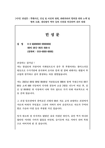 반성문 : 폭행사건, 반성 및 사건의 경위, 피해자와의 합의를 위한 노력 및 합의 도출, 재발방지 약속 등의 사유를 언급하며 선처 탄원 요약정보 및 구매