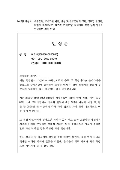 반성문 : 음주운전, 수사기관 제출, 반성 및 음주운전의 경위, 생계형 운전자, 직업상 운전면허가 필수적, 가족부양, 재발방지 약속 등의 사유를 언급하며 선처 탄원 요약정보 및 구매