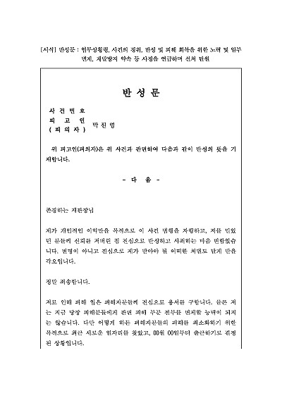 반성문 : 업무상횡령, 사건의 경위, 반성 및 피해 회복을 위한 노력 및 일부 변제, 재발방지 약속 등 사정을 언급하며 선처 탄원 요약정보 및 구매