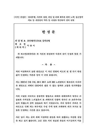 반성문 : 강제추행, 사건의 경위, 반성 및 피해 회복을 위한 노력, 정신병적 치료 등 재발방지 약속 등 사정을 언급하며 선처 탄원 요약정보 및 구매