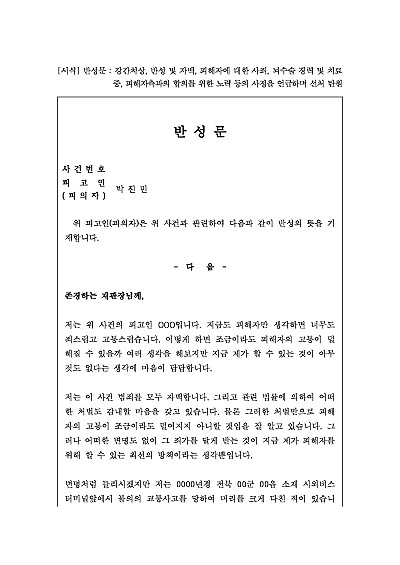 반성문 : 강간치상, 반성 및 자백, 피해자에 대한 사죄, 뇌수술 경력 및 치료 중, 피해자측과의 합의를 위한 노력 등의 사정을 언급하며 선처 탄원 요약정보 및 구매