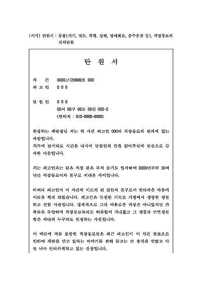 주요내용 :탄원서는 형사 처벌이나 징계 위기에 처한 사람에 대해 선처를 호소하거나, 반대로 엄벌을 요구하는 내용을 담아 수사기관이나 법원에 제출하는 공식 문서로서, 주로 가족, 지인, 직장 동료 등이 작성하며, 피의자나 피고인의 평소 행실과 반성 의지를 설명하여 양형 결정에 영향을 미치게 하려는 목적으로 제출함. 단 무단전재 방지목적으로 PDF 파일로 올리니, 구매하신 후 혹 원본 파일이 필요하신 분들은 톡이나 문자, 메일, 전화 등을 주시면 작성방법 등에 대한 간단한 무료상담과 함께 원본 파일을 보내드리도록 하겠습니다.