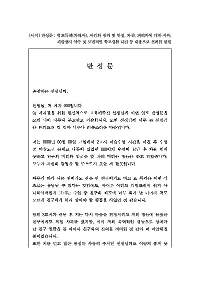 반성문 : 학교폭력(가해자), 사건의 경위 및 반성, 자책, 피해자에 대한 사과, 재발방지 약속 및 모범적인 학교생활 다짐 등 내용으로 선처를 탄원 요약정보 및 구매