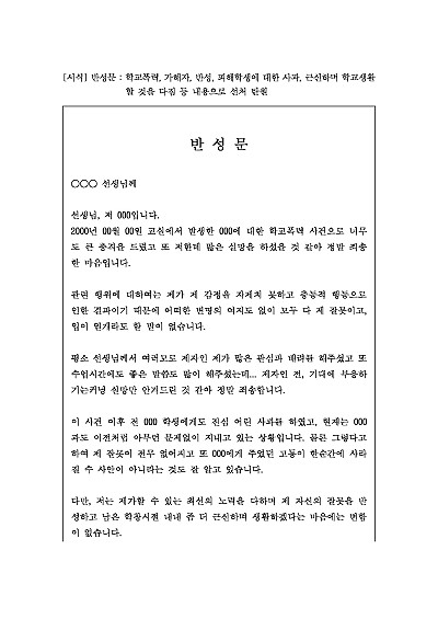 반성문 : 학교폭력, 가해자, 반성, 피해학생에 대한 사과, 근신하며 학교생활 할 것을 다짐 등 내용으로 선처 탄원 요약정보 및 구매