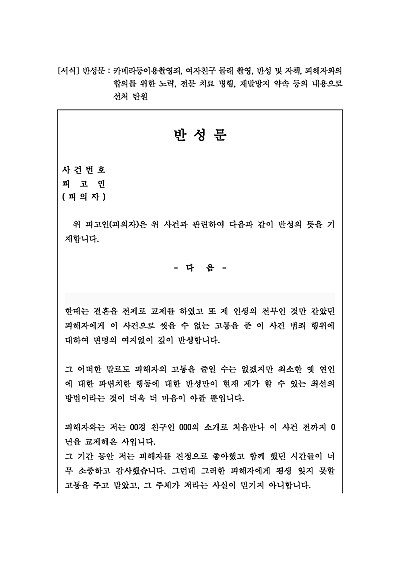 주요내용: 반성문은 피의자나 피고인이 자신의 잘못된 행동을 깊이 뉘우치고 반성하는 마음을 담아 수사기관이나 법원에 제출하는 문서 양식으로써, 이는 재범 방지 의지를 표현하고, 피해자에게 진심으로 사죄하며, 사건에 대한 책임을 인정한다는 의미를 담아 형량 감경에 중요한 영향을 미칠 수 있음.단 무단전재 방지목적으로 PDF파일로 올리니,구매하신 후 혹 원본 파일이 필요하신 분들은 톡이나 문자, 메일, 전화 등을 주시면 작성방법 등에 대한 간단한 무료상담과 함께 원본 파일을 보내드리도록 하겠습니다.