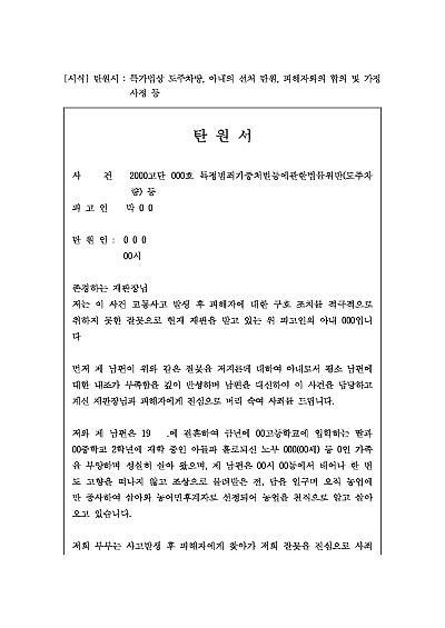 탄원서 : 특가법상 도주차량, 아내의 선처 탄원, 피해자와의 합의 및 가정 사정 등 요약정보 및 구매