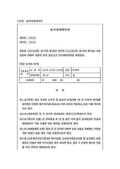 농지매매계약서. 주요내용: 매매대금지급방법, 농지매매허가신청, 제한물권소멸, 소유권이전등기절차 서류 교부, 농지인도시기, 계약해제 등 내용 기재. 단 무단전재 방지목적으로 PDF 파일로 올리니, 구매하신 후 혹 원본 파일이 필요하신 분들은 톡이나 문자, 메일, 전화 등을 주시면 작성방법 등에 대한 간단한 무료상담과 함께 원본 파일을 보내드리도록 하겠습니다.