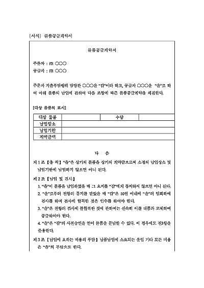 물품 공급계약서, 주요내용 : 납입 및 검사, 비용부담, 계약대금지급방법, 권리의무의 양도, 납기의 연장, 이행지체 손배, 해제 및 위약금, 보증금 등 기재, 단 무단전재 방지목적으로 PDF 파일로 올리니, 구매하신 후 혹 원본 파일이 필요하신 분들은 톡이나 문자, 메일, 전화 등을 주시면 작성방법 등에 대한 간단한 무료상담과 함께 원본 파일을 보내드리도록 하겠습니다.