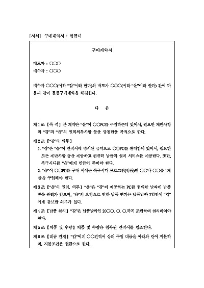 컴퓨터 구매계약서, 주요내용 : 각자 권리와 의무, 제품 및 수량, 결제방법, 남품설치, 유지보수 등 내용 기재. 단 무단전재 방지목적으로 PDF 파일로 올리니, 구매하신 후 혹 원본 파일이 필요하신 분들은 톡이나 문자, 메일, 전화 등을 주시면 작성방법 등에 대한 간단한 무료상담과 함께 원본 파일을 보내드리도록 하겠습니다.