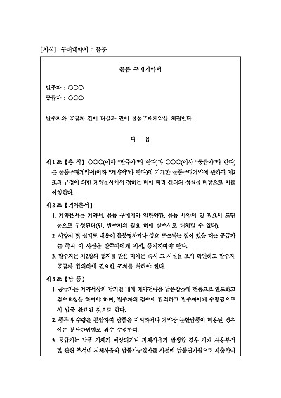 물품구매계약서, 주요내용 : 납품, 규격 및 품질, 검수, 포장 및 표지, 권리의무의 양도금지, 특허 및 상호, 대금지급 및 대금지급 특례 등 내용 기재. 단 무단전재 방지목적으로 PDF 파일로 올리니, 구매하신 후 혹 원본 파일이 필요하신 분들은 톡이나 문자, 메일, 전화 등을 주시면 작성방법 등에 대한 간단한 무료상담과 함께 원본 파일을 보내드리도록 하겠습니다.