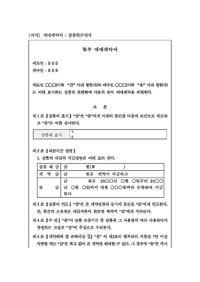 상품 할부매매계약서, 주요내용 : 할부대금지급 방법 및 AS, 할부대금 지급 지체 및 해제 등, 파손책임, 기한의 이익상실 조항 등 기재. 단 무단전재 방지목적으로 PDF 파일로 올리니, 구매하신 후 혹 원본 파일이 필요하신 분들은 톡이나 문자, 메일, 전화 등을 주시면 작성방법 등에 대한 간단한 무료상담과 함께 원본 파일을 보내드리도록 하겠습니다.