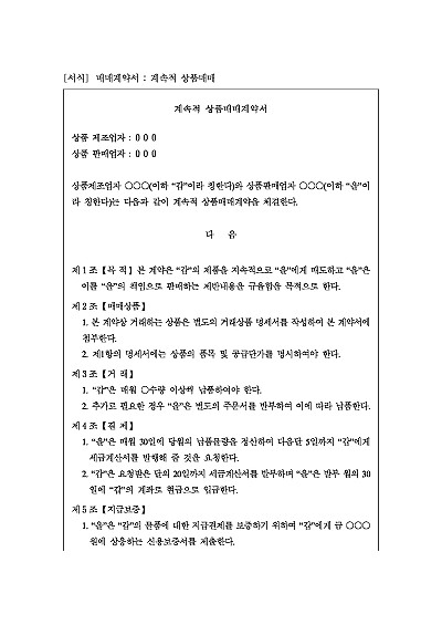 계속적 상품 거래계약서. 거래방법, 결제 및 지급보증 방법, 대금지체 연제이자율, 상품의 품질, 계약해지 등 내용 기재, 단 무단전재 방지목적으로 PDF 파일로 올리니, 구매하신 후 혹 원본 파일이 필요하신 분들은 톡이나 문자, 메일, 전화 등을 주시면 작성방법 등에 대한 간단한 무료상담과 함께 원본 파일을 보내드리도록 하겠습니다.