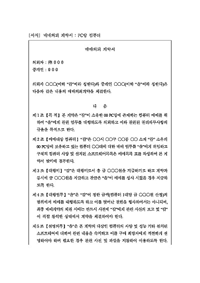 PC방 컴퓨터 매매의뢰계약서, 대행업무 법위 및 대행비, PC방 출입, 계약해지, 비밀유지 . 단 무단전재 방지목적으로 PDF 파일로 올리니, 구매하신 후 혹 원본 파일이 필요하신 분들은 톡이나 문자, 메일, 전화 등을 주시면 작성방법 등에 대한 간단한 무료상담과 함께 원본 파일을 보내드리도록 하겠습니다.