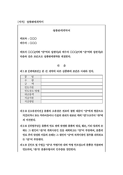 상품판매계약서, 주요내용 : 판매조건, 소유권이전, 위험부담, 대금지급, 지체상금, 기한의 이익상실, 하자담보책임 등 내용 기재. 단 무단전재 방지목적으로 PDF 파일로 올리니, 구매하신 후 혹 원본 파일이 필요하신 분들은 톡이나 문자, 메일, 전화 등을 주시면 작성방법 등에 대한 간단한 무료상담과 함께 원본 파일을 보내드리도록 하겠습니다.