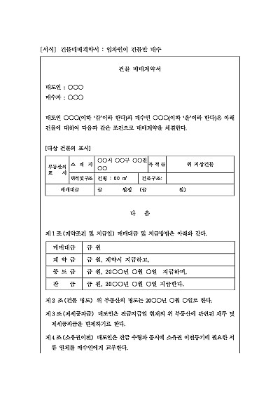 건물매매계약서(임차인이 건물만 매수). 주요내용 : 매매대금 지급방법, 명도시기, 제세공과금 부담, 소유권이전관련 서류 교부, 위약금 등 내용 기재. 단 무단전재 방지목적으로 PDF 파일로 올리니, 구매하신 후 혹 원본 파일이 필요하신 분들은 톡이나 문자, 메일, 전화 등을 주시면 작성방법 등에 대한 간단한 무료상담과 함께 원본 파일을 보내드리도록 하겠습니다.