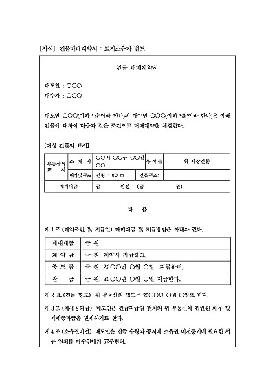 건물매매계약서. 주요내용 : 매매대금 지급방법, 명도시기, 제세공과금 부담, 소유권이전등기서류 교부, 위약금 등 내용 기재. 단 무단전재 방지목적으로 PDF 파일로 올리니, 구매하신 후 혹 원본 파일이 필요하신 분들은 톡이나 문자, 메일, 전화 등을 주시면 작성방법 등에 대한 간단한 무료상담과 함께 원본 파일을 보내드리도록 하겠습니다.
