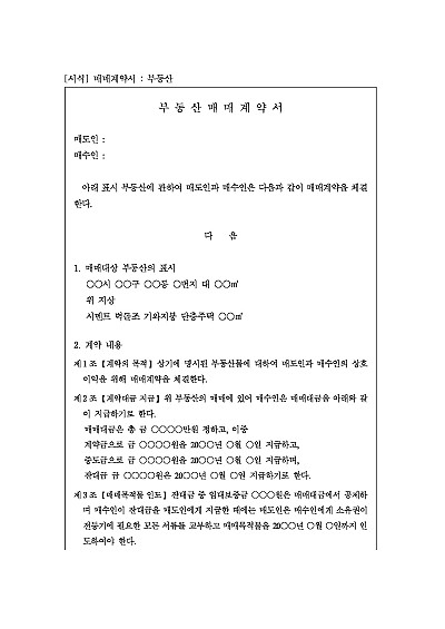 부동산매매계약서, 매매목적물표시, 매매대금지급방법, 목적물 인도 및 등기절차, 제세공과금부담, 계약위반시 손배예약 등 내용 기재. 단 무단전재 방지목적으로 PDF 파일로 올리니, 혹 원본 파일이 필요하신 분들은 톡이나 문자, 메일, 전화 등을 주시면 작성방법 등에 대한 간단한 무료상담과 함께 원본 파일을 보내드리도록 하겠습니다.