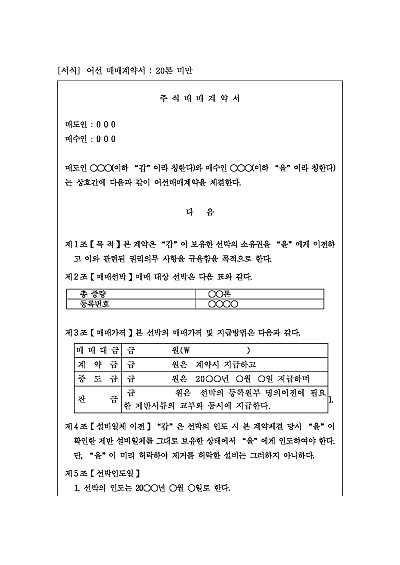 어선 매매계약서 양식, 주요내용 : 매매대금 지급방법, 어선설비일체 이전, 제한물권 부존제, 어망 등 인도, 위약벌 약정 등의 내용 기재. 단 무단전재 방지목적으로 PDF 파일로 올리니, 구매하신 후 혹 원본 파일이 필요하신 분들은 톡이나 문자, 메일, 전화 등을 주시면 작성방법 등에 대한 간단한 무료상담과 함께 원본 파일을 보내드리도록 하겠습니다.
