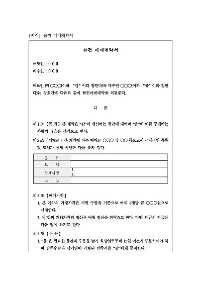 상품 등 물건 매매계약서 양식, 주요내용 : 매매가격 및 주문 및 납품기간, 기술제공, 납부지연에 따른 지연이자, 검수 및 손배청구, 예치금, 계약해지 등 내용 기재. 단 무단전재 방지목적으로 PDF 파일로 올리니, 구매하신 후 혹 원본 파일이 필요하신 분들은 톡이나 문자, 메일, 전화 등을 주시면 작성방법 등에 대한 간단한 무료상담과 함께 원본 파일을 보내드리도록 하겠습니다.