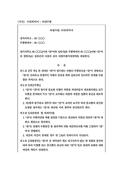 차량부품 거래계약서 양식, 주요내용 : 공급방법 및 결제방법, 단가, 사정변경, 계약기간, 계약해지 등 내용 기재. 단 무단전재 방지목적으로 PDF 파일로 올리니, 구매하신 후 혹 원본 파일이 필요하신 분들은 톡이나 문자, 메일, 전화 등을 주시면 작성방법 등에 대한 간단한 무료상담과 함께 원본 파일을 보내드리도록 하겠습니다.