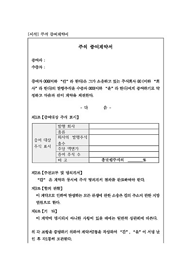 주식증여계약서, 증여대상 주식의 표시, 주권교부 및 명의개서 절차, 분쟁시 관할합의 등 내용 기재, 단 무단전재 방지목적으로 PDF 파일로 올리니, 혹 원본 파일이 필요하신 분들은 톡이나 문자, 메일, 전화 등을 주시면 작성방법 등에 대한 간단한 무료상담과 함께 원본 파일을 보내드리도록 하겠습니다.