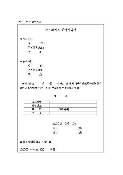 골프장회원권 증여계약서, 증여대상 표시 등 기본적인 증여계약 내용 기재. 단 무단전재 방지목적으로 PDF 파일로 올리니, 혹 원본 파일이 필요하신 분들은 톡이나 문자, 메일, 전화 등을 주시면 작성방법 등에 대한 간단한 무료상담과 함께 원본 파일을 보내드리도록 하겠습니다.