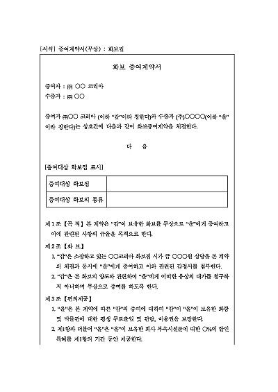 화보 무상 증여계약서, 목적, 대상화복 표시, 화보제공에 따른 편의제공 내용, 진위확인 방법, 분쟁해결 등 내용 기재, 단 무단전재 방지목적으로 PDF 파일로 올리니, 혹 원본 파일이 필요하신 분들은 톡이나 문자, 메일, 전화 등을 주시면 작성방법 등에 대한 간단한 무료상담과 함께 원본 파일을 보내드리도록 하겠습니다.